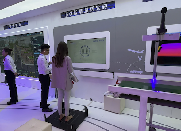 另一台让人忍不住脱鞋一试的是“5G智慧量脚定鞋”展示项目,体验者在裸足状态下站到测量平台上,经过设备对足部与脚踝进行3D扫描后,就能获得左右脚的详细数值,例如从上图中就能发现,测试者的脚型偏瘦,右脚略长于左脚,但左脚承重更多,并存在足外翻的现象。系统还能根据测量结果来推荐相应的鞋款。此项目显然避免了在现实选鞋过程中,所谓的鞋肥、不跟脚、穿着费力等问题,用户也能通过数字来客观准确了解自己的足型。