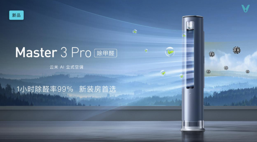 本次新品发布,云米带来了空调新品Master3Pro,该产品将国家863计划科研成果——活性锰除甲醛技术应用于空调行业,凭借每小时99%的除醛率成为新房装修的首选。Mater3Pro的除甲醛滤网有数万个蜂窝单元组成,除甲醛图层面积高达5㎡,甲醛分子经过滤网会被分解成水和二氧化碳。即便在24小时除醛+送风模式下,两天的耗电量依然不到一度。此外,UVC除菌紫外杀菌也是标配,对H1N1等流感病毒的除菌率达到99.9%。再算上加湿功能,拥有一台云米Master3Pro空调就相当于拥有了冷暖调节、消毒、除湿以及空气净化四大功能。