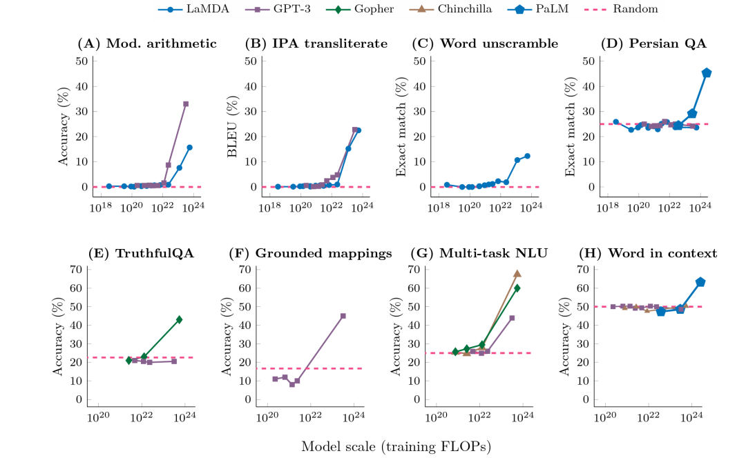 大语言模型的涌现现象,在一定规模后迅速涌现出新能力;图片来源:谷歌、斯坦福、DeepMind:大型语言模型的涌现能力