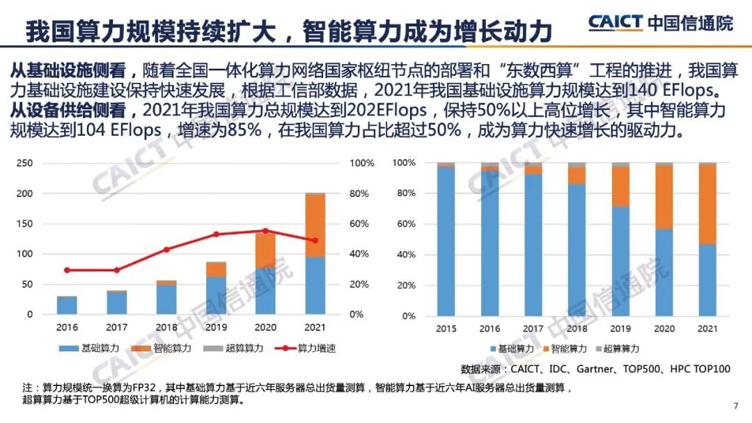 中国信通院数据显示,2016年智能算力在中国算力中的占比仅为 3%,到2021 年占比已经超过通用算力,达到 51%。