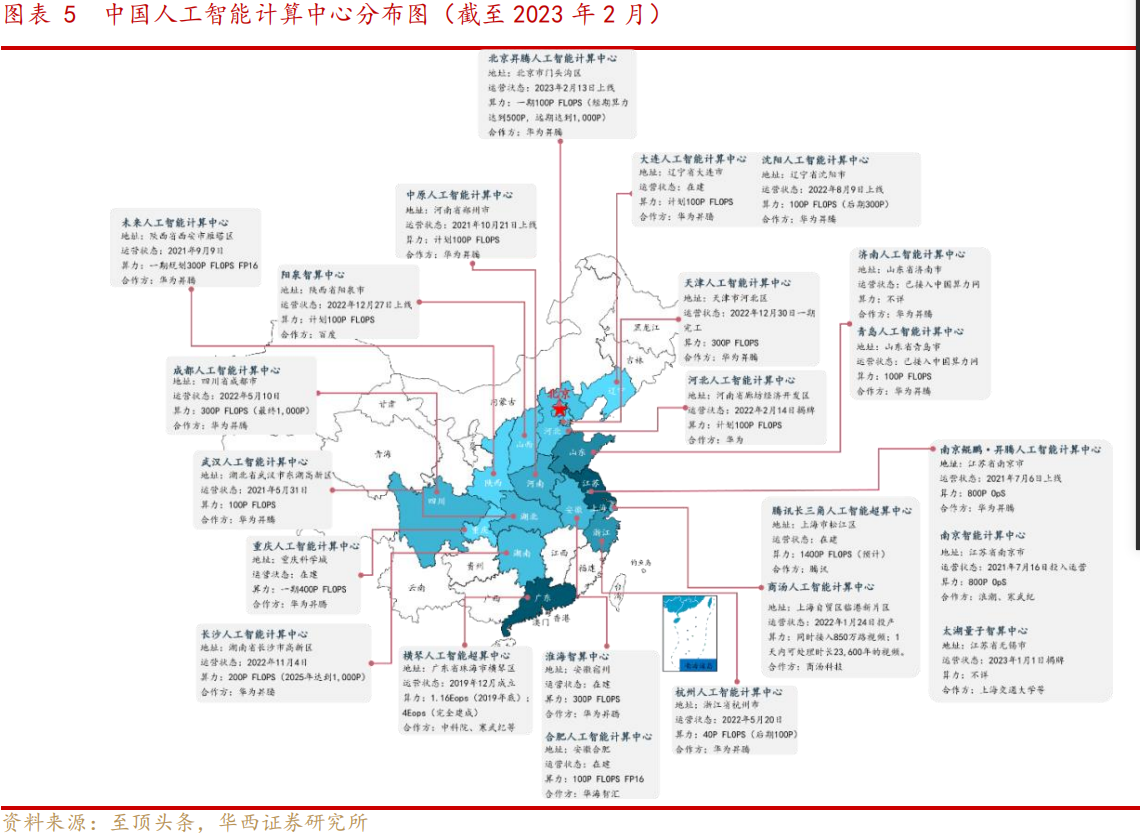 据至顶智库统计,截至2023年2月,全国投入运营、在建的人工智能计算中心达23个,其中上海成为首家智算超算双中心。从合作方来看,华为、腾讯、百度等大厂都在积极参与。