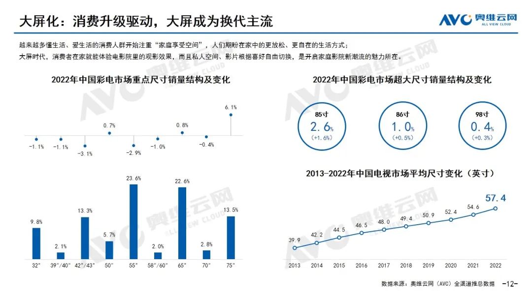 首先是大屏化方面,近几年国内电视市场的平均尺寸一直在增大。奥维云网数据显示,2013年平均尺寸仅为39.9英寸,2022年已经达到57.4英寸。以前买电视主流选择可能是32/43吋,55英寸就已经是大屏了,但如今55英寸只是最低标准,更多人偏向于选择75/86这种尺寸。从销量上看,去年55吋产品的占比为23.6%,同比下滑2.9%;65吋的占比为22.6%,同比增长0.8%;85/86/98吋也分别增长2.6%、1%和0.4%,大屏已经成为一种主流趋势。