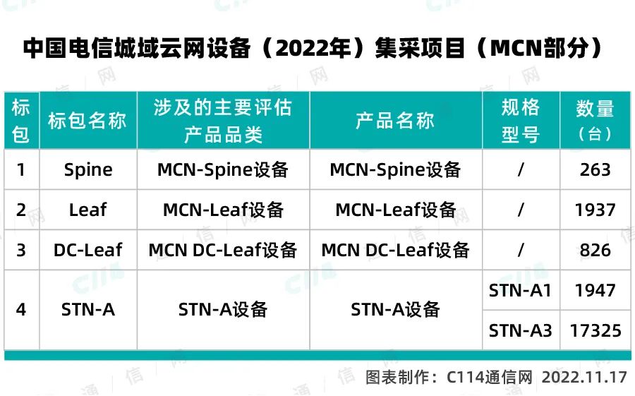 据此前中国电信发布的集采公告显示,本项目采购的MCN设备主要包括MCN-Spine设备、MCN-Leaf设备、MCN-DC-Leaf设备和STN-A设备。采购总量共计22298台。项目共划分成4个标包,具体的产品名称以及预估集采数量如下表所示: