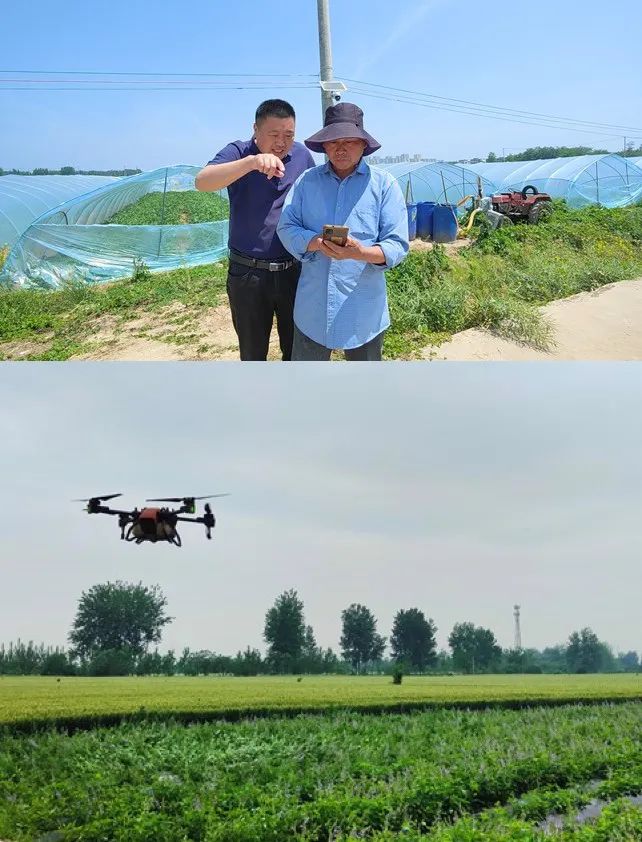 图为邢寨自然村种粮大户邢东晓在用5G智能手机操控无人机为小麦喷洒农药。(阜阳铁塔供图)