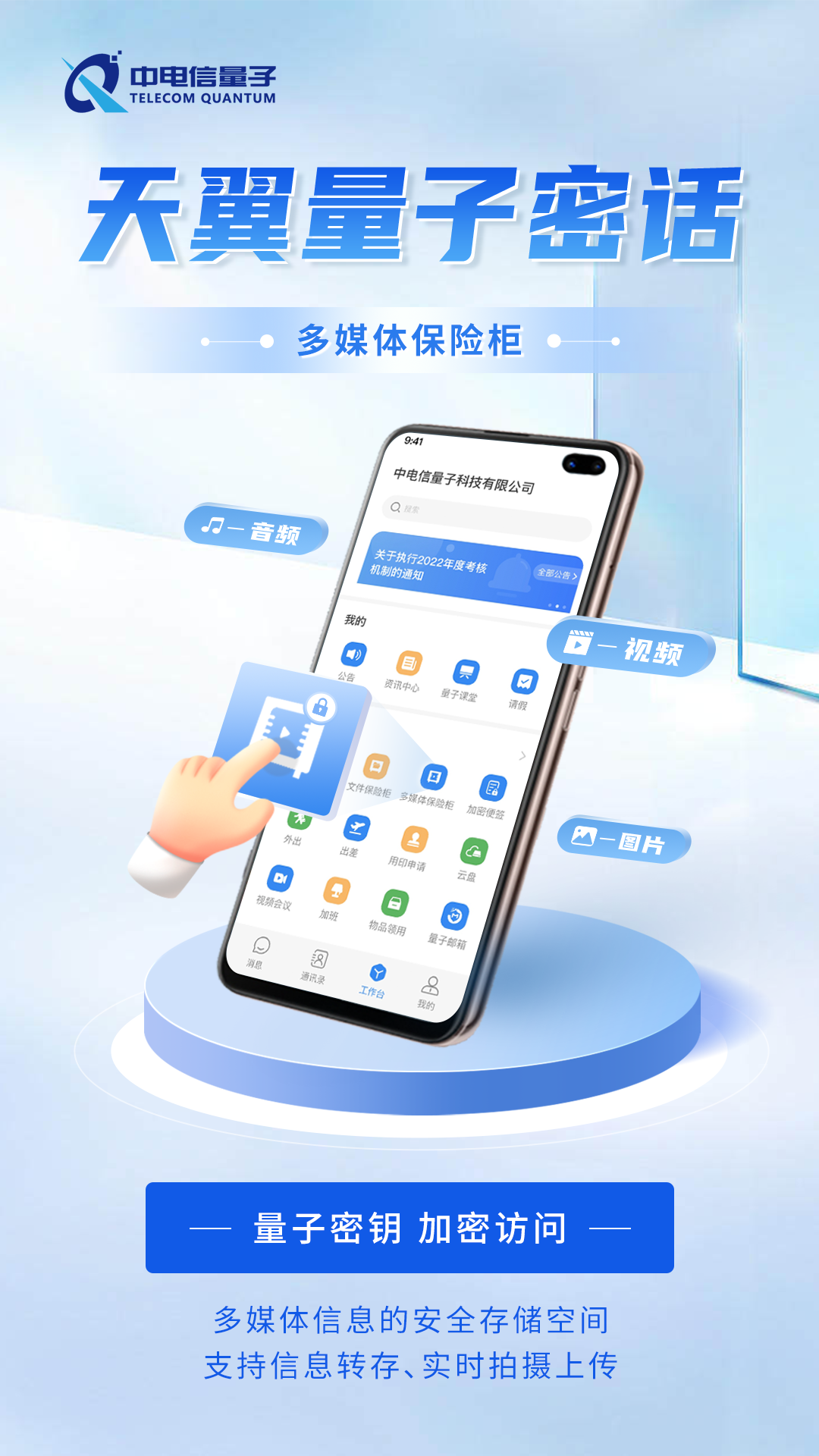 多媒体保险柜支持聊天会话中多媒体信息的一键转存,支持手机实时拍摄上传。使用量子密钥 + 多因子认证保护用户信息安全。