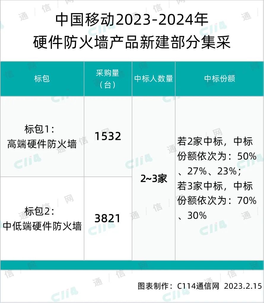 据此前中国移动发布的集采公告显示,本次硬件防火墙产品包括高端和低端两部分,预估规模约5353台。项目采用混合招标,共划分成2个标包,项目允许投标人同时中标的最多标包数为2个。
