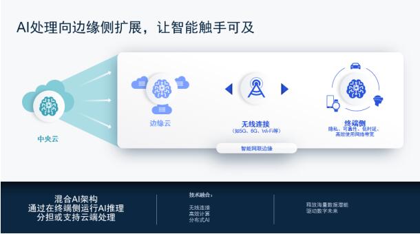 AI是和5G并行发展的另外一项关键技术。随着5G加速扩展,AI处理正不断向边缘侧扩展。高通公司认为未来的人工智能将会是混合AI架构,AI会在云端、边缘云和终端侧协同运行,使整个系统中的计算和处理能力以最有效的方式重新分布,开启智能网联边缘的规模化变革。