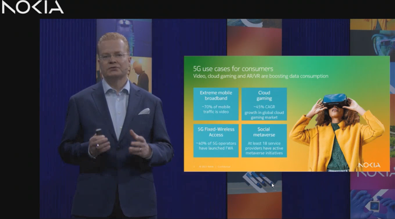 “对于消费者而言,视频、云游戏和增强现实(AR)/虚拟现实(VR)等5G应用正在推动数据消费量的增加。比如:移动宽带的70%的移动流量用于视频;全球云游戏市场正以45%的年复合增长率增长;40%的5G运营商已经推出了FWA(5G固定无线接入)服务;目前至少有18家服务供应商正在积极推动元宇宙计划。