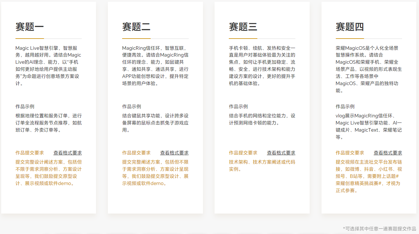 作为荣耀面向万物互联未来、参与全球竞争的核心战略点,AI使能的全场景智慧操作系统荣耀MagicOS以“MagicRing信任环”、“Magic Live智慧引擎”、“Turbo X系统引擎”和“MagicGuard荣耀安全”为四大根技术,打造越用越好用、越用越懂你的智慧互联体验。依托MagicOS的强大技术支撑,2023荣耀创意精英挑战赛结合科技创新与体验升级设置四大赛题: