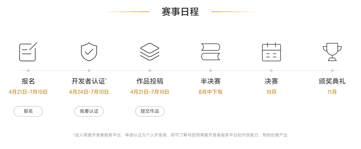 大赛全程分为报名投稿、半决赛、决赛、颁奖典礼四大阶段,目前大赛报名通道已全面开启,截稿时间为7月10日18:00。报名成功后即可登陆荣耀开发者服务平台快速完成开发者认证,直接获得平台开放的技术与知识助力。