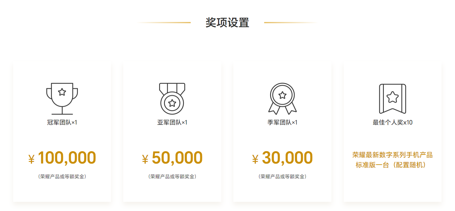 本届赛事时间跨度历时半年,10月举办决赛,将选出1支冠军团队、1支亚军团队、1支季军团队,分别给予10万元荣耀产品或等额奖金、5万元荣耀产品或等额奖金、3万元荣耀产品或等额奖金的丰厚奖励。另外,大赛将选出最佳个人奖10名,给予每人1台荣耀最新数字系列标准版手机作为奖励。