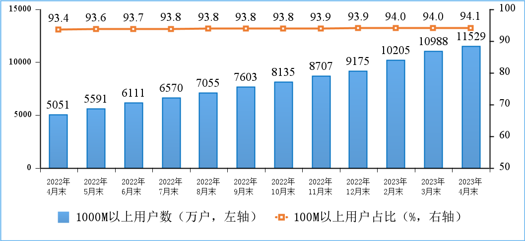 固定宽带接入用户规模稳步增加,千兆用户占比近两成。截至4月末,三家基础电信企业的固定互联网宽带接入用户总数达6.08亿户,比上年末净增1811万户。其中,100Mbps及以上接入速率的固定互联网宽带接入用户达5.72亿户,占总用户数的94.1%;1000Mbps及以上接入速率的固定互联网宽带接入用户达1.15亿户,占总用户数的19%,比上年末净增2354万户。在高速率用户持续增长拉动下,家庭户均接入带宽达397.2Mbps/户,同比增长28.6%。