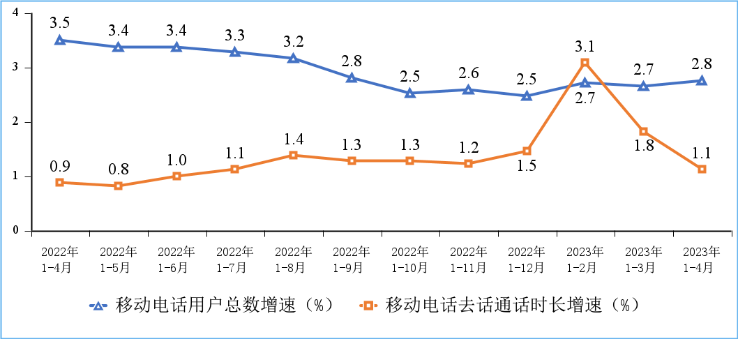 移动电话通话量低速增长,移动短信业务量稳步增长。1—4月份,移动电话去话通话时长完成7409亿分钟,同比增长1.1%;固定电话主叫通话时长完成256.7亿分钟,同比下降3.6%。1—4月份,全国移动短信业务量同比增长5.1%,移动短信业务收入同比下降0.4%,增速较一季度分别回落0.1个和1.8个百分点。