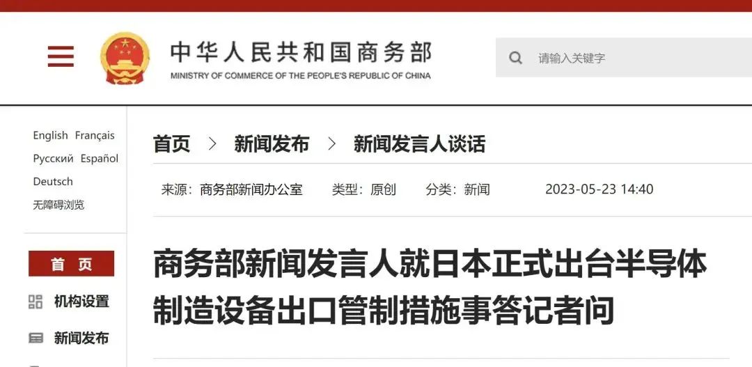 商务部新闻发言人就此事称,日本政府正式出台针对23种半导体制造设备的出口管制措施,这是对出口管制措施的滥用,是对自由贸易和国际经贸规则的严重背离,中方对此坚决反对。