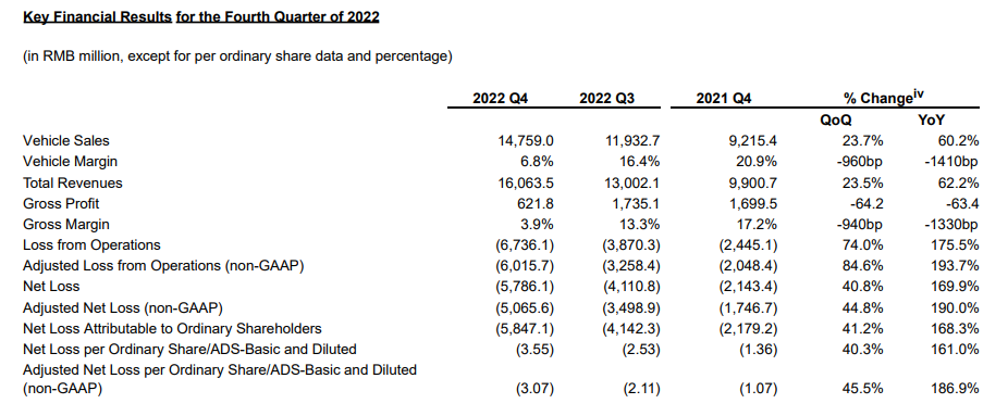 从蔚来汽车发布的 2022 年第四季度及全年财报来看,蔚来虽连续 11 个季度实现正增长,达到 160.6 亿元,但低于市场预期的 172 亿元。同时,亏损也在进一步扩大。四季度净亏损扩大至 57.86 亿元,同比增长 169.9%。2022 年全年净亏损达 144.37 亿元,较上年同期亏损扩大 259.4%。