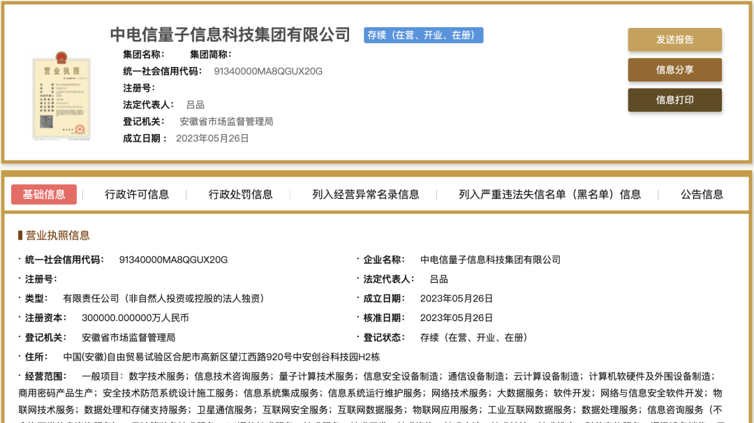 从国家企业信用信息公示系统知悉,中电信量子信息科技集团有限公司成立,注册资本30亿元人民币,该公司由中国电信股份有限公司100%控股。