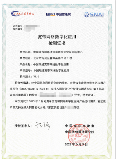 中国联通作为自智网络领航计划的参与者,积极布局新技术、新产品.经过3年的研究,面向家庭宽带质差场景实现了宽带网络端到端的智能化定位和整治。覆盖宽带网络运营的“规建维优营服”各生产环节,以数字化、智能化的全国集约宽带网络数字化应用,赋能31省一线生产工作。在中国信息通信研究院组织的首次检测认证中,中国联通宽带网络数字化应用符合《CCSA/TC610S-2023-01光接入网智能化分级评估测试方法第1部分:家宽质差场景》的检测要求,同时也是国内首个通过自智网络智能化分级等级评测的运营商应用。