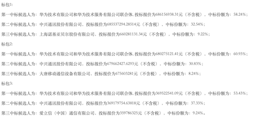 标包1(9147站),华为投标报价6.86亿元(不含税,下同),份额58.24%;中兴通讯投标报价6.86亿元,份额32.54%;诺基亚贝尔投标报价6.60亿元,份额9.22%。