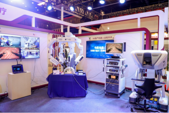 中国电信展示的5G手术机器人,通过5G定制网信号传输,远在邵逸夫医院的专家操作在医院的手术机器人医生端,向位于北京展区的机械臂发出动作指令。在高清视野辅助下,远程专家可以通过可转腕机械臂的灵活操作,精准完成对模型的解剖、分离、缝合等各项手术模拟动作。