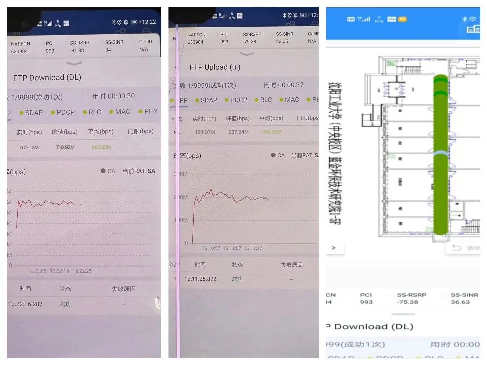 本次在蓝金环保楼采用LightSite3.0三点位部署,在仅开通首载波100M带宽的情况下,5G下行峰值速率达710Mbps,上行峰值速率达237Mbps;5G拉网测试下行平均速率达680Mbps,上行平均速率达194Mbps。