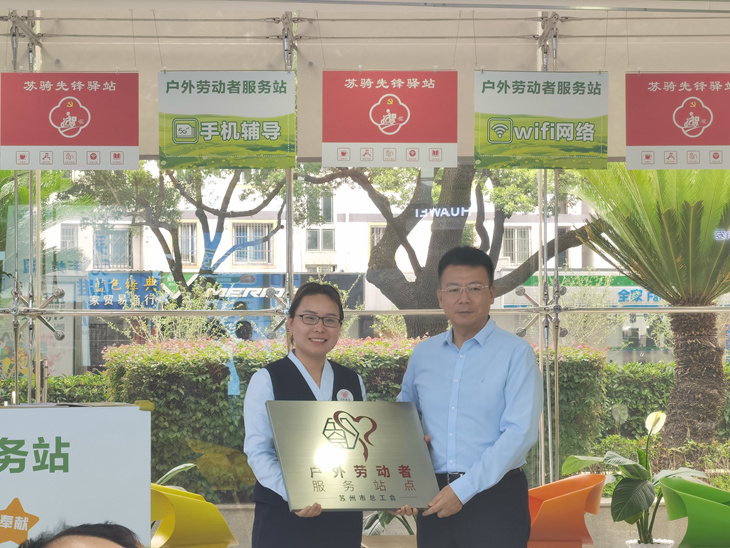 现场还举行了2022年度“全国最美工会户外劳动者服务站点”授牌仪式,苏州市总工会张晓华副部长宣读了《中华全国总工会办公厅关于确认2022年“最美工会户外劳动者服务站点”名单的通知”》,苏州市总工会吴洪斌副主席向干将西路营业厅店长授予铜牌。姑苏区分工会张晓东主席表示欢迎各界户外劳动者到营业厅服务站来歇歇脚、喝口茶。