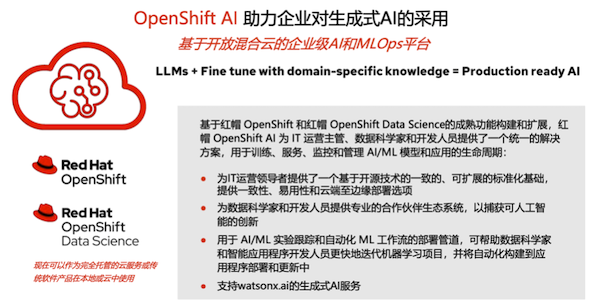 峰会期间发布的OpenShift AI能够全面助力企业生成式AI的全流程,基于红帽OpenShift和红帽 OpenShift Data Science的成熟功能构建和扩展,红帽OpenShift AI为IT运营主管、数据科学家和开发人员提供了一个统一的解决方案,用于训练、服务、监控和管理AI/ML模型和应用的生命周期。