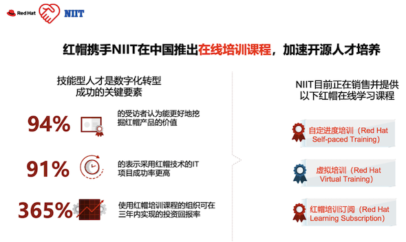 今年红帽还正式宣布与NIIT合作,并已于3月1日起在中国提供红帽培训课程。中国企业和IT专业人士现在可以访问NIIT的RedHat.Training-China.com平台购买并获取红帽培训在线学习课程,打造涵盖云计算、容器、虚拟化和自动化等红帽解决方案关键领域的技能。