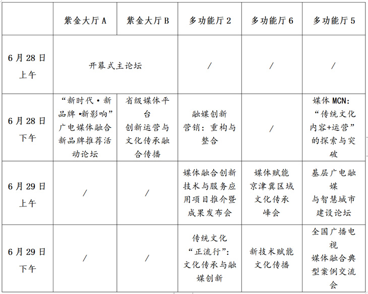 大会还将设置12场主题研讨和专题活动,包括:“新时代·新品牌·新影响”广电媒体融合新品牌推荐活动、全国广播电视媒体融合典型案例交流、传统文化“正流行”:文化传承与融媒创新、媒体赋能京津冀区域文化传承、省级媒体平台创新运营与文化传承融合传播、媒体融合创新技术与服务应用项目推介暨成果发布、“这里是北京!”文化传承直播活动等。同时,大会将配套举办媒体融合发展相关展览展示活动。