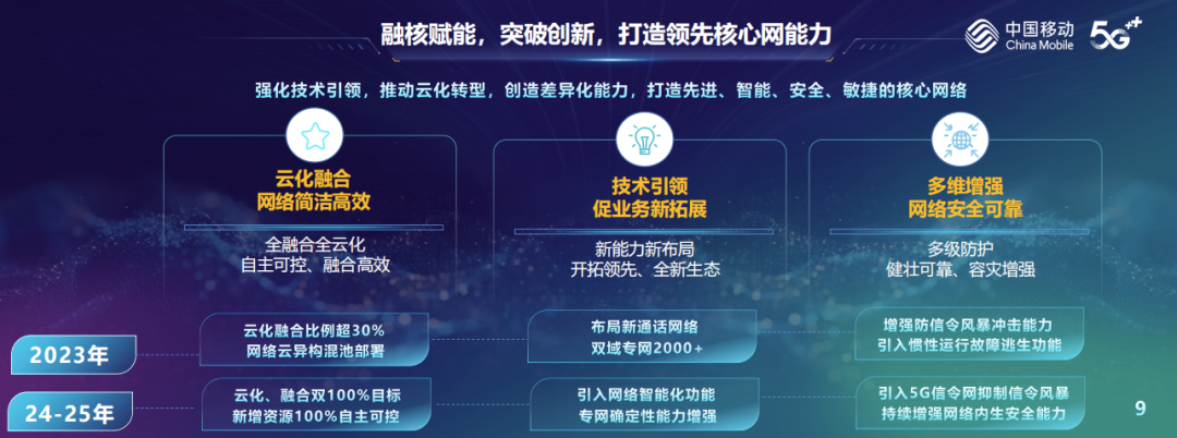 在核心网领域,持续强化技术引领,推动云化转型,创造差异化能力,打造先进、智能、安全、敏捷的核心网络。一要以全融合全云化为目标,持续推动云化转型,促进网络简洁高效。云化融合功能、容量比例提升至2025年的双100%,2024年起网络云新增服务器实现100%的自主可控;二要积极通过技术引领开创新业务、新生态。2C市场方面,年内完成新通话网络能力部署,实现商用;2B市场方面,快速部署“安全、无感、漫游”双域专网方案,支撑政企推动双域专网项目,向更多领域拓展;同时,还要多维度增强网络的安全性、健壮性。