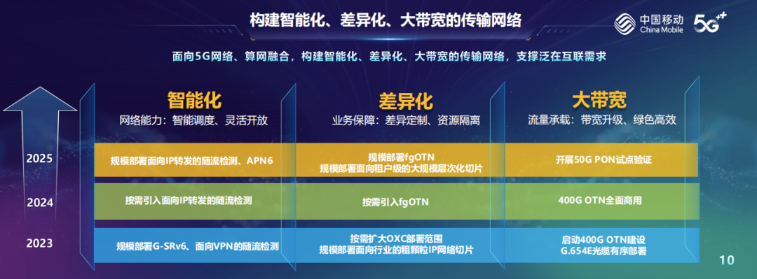 在传输网领域,面向5G网络、算网融合,构建智能化、差异化、大带宽的传输网络。在智能化方面,推进部署G-SRv6、随流检测、APN6等技术,实现网络能力智能调度、灵活开放。在差异化方面,按需扩大OXC部署范围,推动IP网络层次化切片、fgOTN技术成熟、应用,实现业务保障差异定制、资源隔离。在大带宽方面,加快推动400G路由器、OTN商用,推动50G PON成熟,聚焦重点段落有序部署G.654E光缆,保障流量承载带宽升级、绿色高效。