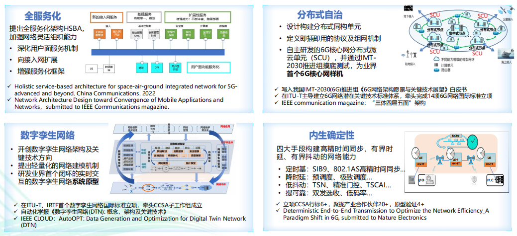 其中,新型网络架构是6G系统顶层设计的重要基础,面向6G网络覆盖全域化、性能沉浸化、要素融合化、网络平台化的发展趋势,前瞻性设计一套基础网络架构、满足多样化的信息服务需求至关重要。中国移动在业界首次系统化“三体四层五面”6G网络架构设计,获得院士专家高度评价。并且,针对6G全服务化、分布式自治网络、数字孪生网络以及内生确定性网络,中国移动已经形成一系列技术研究成果。