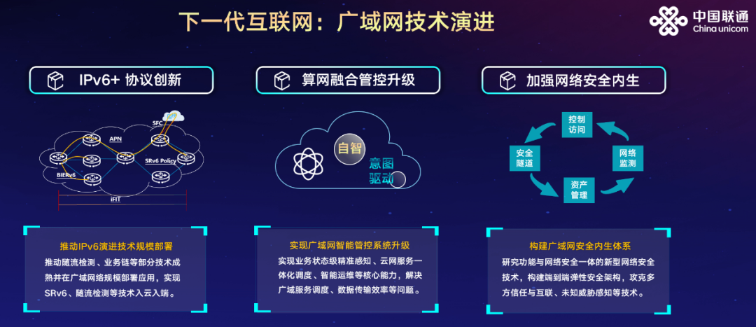 在广域网技术方面,中国联通将通过“IPv6+”协议创新、算网融合管控升级、加强网络内生安全来推动下一代互联网的融合演进,同时通过部署IPv6演进技术提升互联网的端到端协同服务能力,实现广域网络承载能力、感知能力、调度能力、安全能力增强。