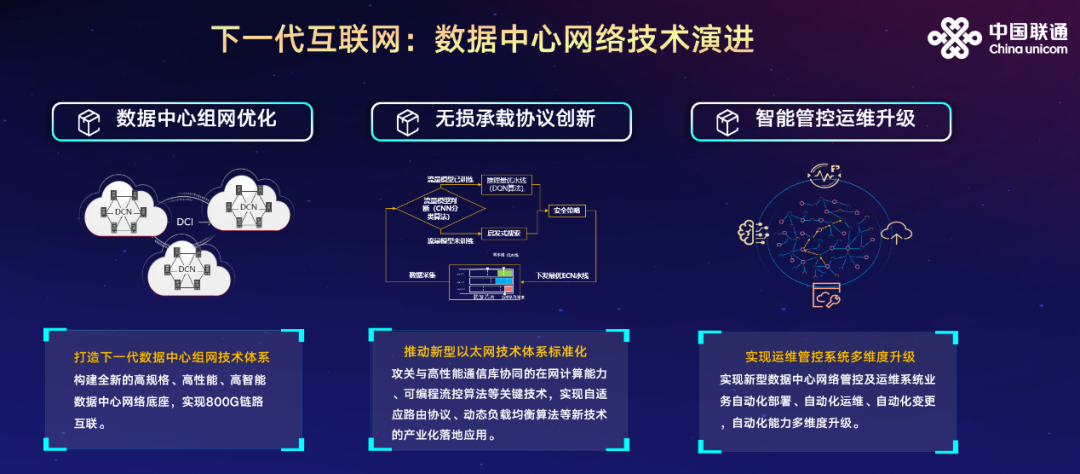 在数据中心网络技术方面,中国联通将聚力打造下一代数据中心组网技术体系,全力推动新型以太网技术体系标准化,力争实现运维管控系统多维度升级。未来,分布式计算、存储成为智能计算中心常态,大规模算力需要计算与网络深度融合,而数据中心网络是算力提升的关键。