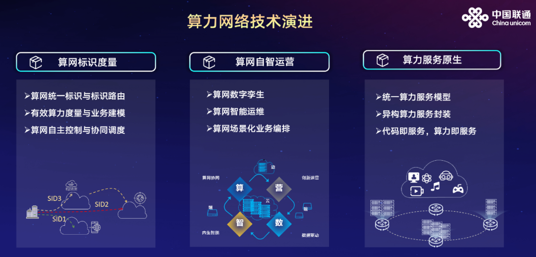 在算力网络技术领域,通过统一标识与标识路由,有效的算力度量与业务建模,算网自主可控与协同调度来实现加强算网标识度量,通过数字孪生、智能运维以及场景化的业务编排来实现算网自智运营,通过统一算力服务模型、异构算力服务封装来实现算力服务原生。