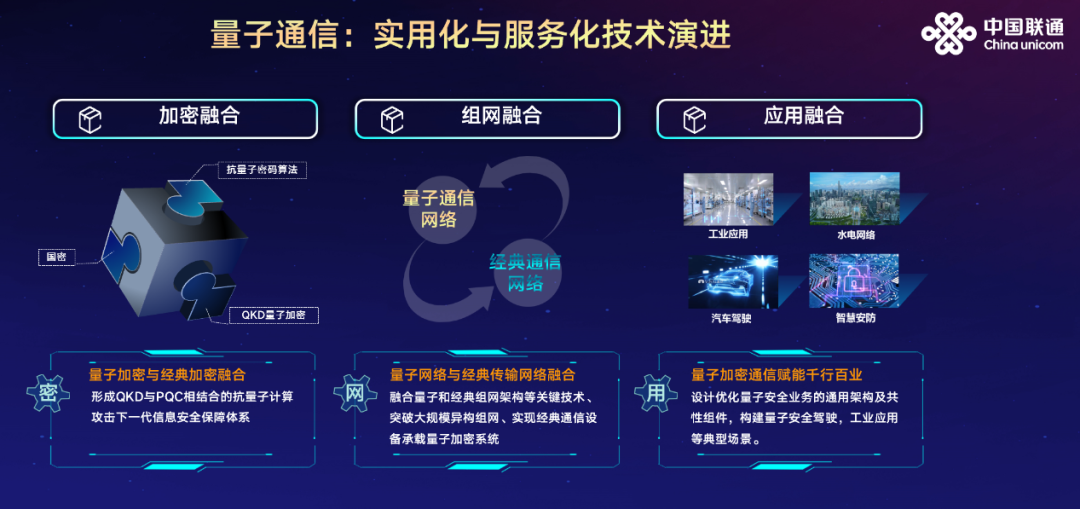 在量子通信领域,打造骨干网DV+城域网CV的广域异构量子通信网络,实现“量子+经典”通信融合、“QKD+PQC”加密融合的抗量子计算攻击安全保密基础设施工程,实现车联网、语音通话、视频会议等政企应用场景示范。