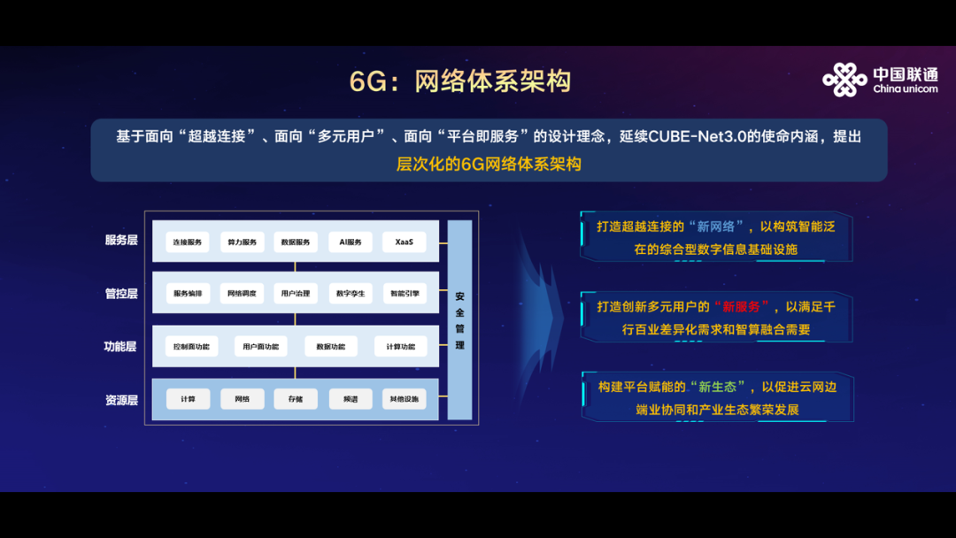 最后,唐雄燕发布了《中国联通6G网络体系架构白皮书》,该白皮书以 CUBE-Net3.0 网络创新体系倡导的“新网络,新服务,新生态”理念为基础,明确提出 6G 网络的目标架构是成为新一代数智服务使能平台,并指出6G网络架构设计的“三个面向”,即面向“超越连接”、面向“多元用户”和面向“平台赋能”,并在此基础上,设计了包含资源层、功能层、管控层和服务层的6G体系架构。