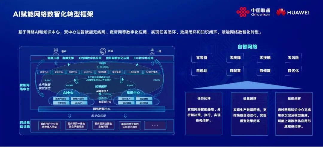 欧大春提出了AI赋能网络数智化转型框架,中国联通将通过任务闭环、效果闭环、知识闭环等三个闭环,赋能自智网络“4零4自”的高阶迈进,助力网络智能化水平提升、运营效率提升和差异化竞争力的实现。
