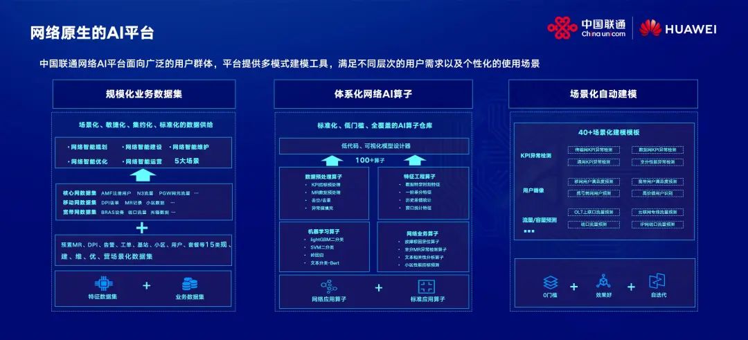 随后,进一步介绍了网络原生的AI平台,平台成果包括:面向“网络AI场景”的数据集资产体系、面向网络规建维优营的场景化特征数据集、自主研发的100+网络AI算子、40个场景化自动建模能力、先进的MLOps模型生产运营流水线等。