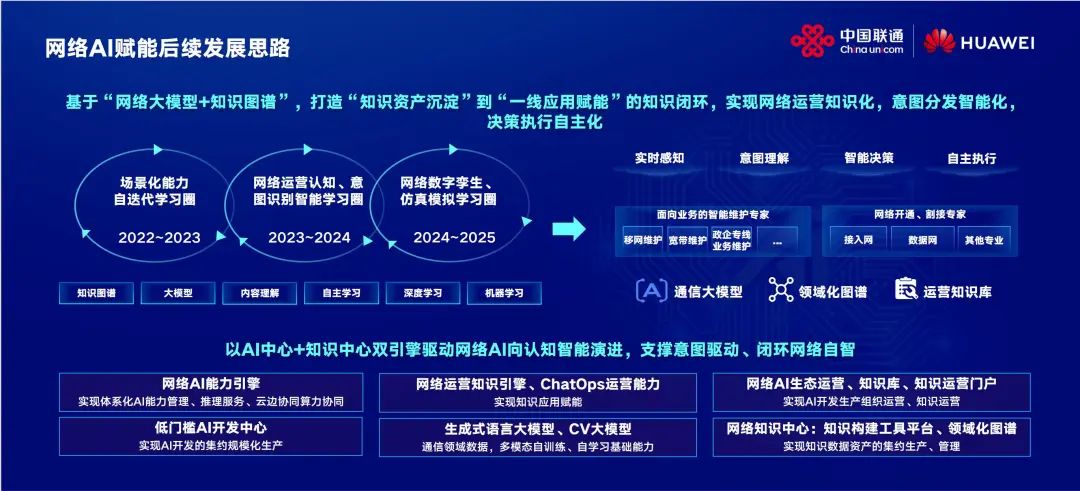 对于网络AI赋能后续的发展,欧大春表示:中国联通将以AI中心+知识中心双引擎驱动网络AI向认知智能演进,支撑意图驱动、闭环网络自智,逐年升级能力学习圈,基于“网络大模型+知识图谱”,打造“知识资产沉淀”到“一线应用赋能”的知识闭环,实现网络运营知识化,意图分发智能化,决策执行自主化。