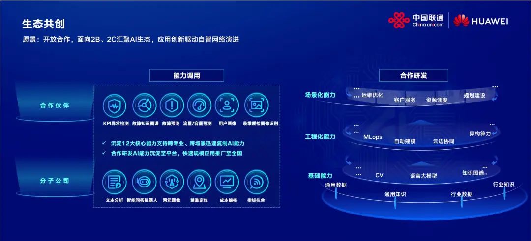 最后,秉持着开放合作的态度汇聚AI生态,欧大春希望各个合作伙伴与中国联通在积极调用网络AI平台能力的同时加强在重点领域的合作研发:如基础能力方面的CV/NLP/多模态大模型、知识图谱的应用研究;工程化能力方面进行、MLops、自动建模、云边协同、异构算力,以及基于大模型的MaaS服务的研究等;在场景化能力方面围绕网络的功能域、控制域和运营域打造高价值差异化竞争能力。