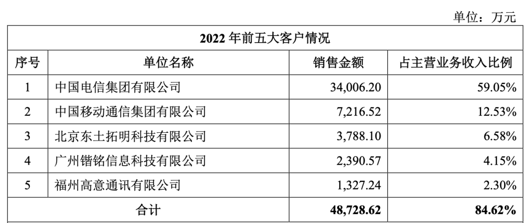 其中,2022年中国电信为欣诺通信第一大客户,产生营收3.40亿元,占营收比重的59.05%;中国移动位居第二大客户,产生营收7217万元,占营收比重的12.53%。
