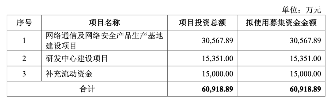 欣诺通信计划登陆科创板,募集资金投向网络通信及网络安全产品生产基地建设项目、研发中心建设项目及补充流动资金。如下: