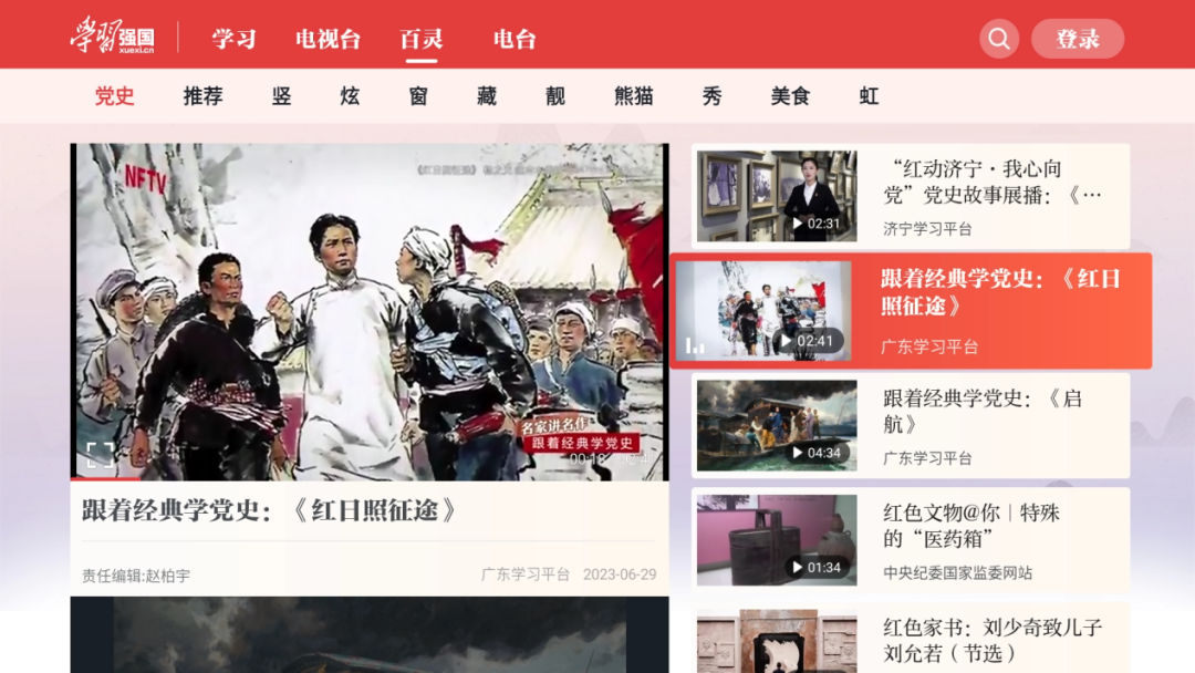 “强国TV”平台设置了学习、电视台、百灵、电台四大学习版块,不仅可以满足用户学习新思想、新理论的需求,还提供一系列政务新闻、生活服务,汇集正能量影视剧、短视频等。平台还首次开放了游客模式,降低用户观看门槛,用户不用注册立即进入可直接浏览各个版块内容。