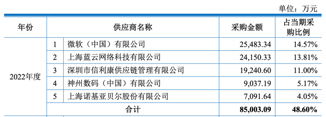 2022年度,微软是昆仑联通的第一大供应商,采购金额25,483.34万元,占比14.57%。