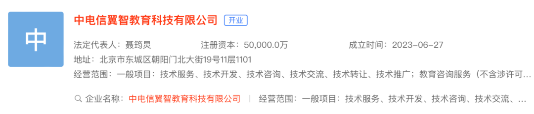 中电信翼智教育科技有限公司于2023年6月27日成立,法定代表人为聂筠炅,注册资本5亿元,由中国电信股份有限公司全资持股。