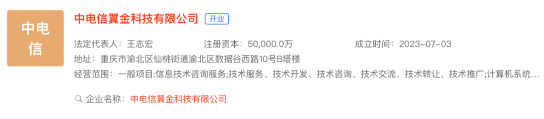 中电信翼金科技有限公司于2023年7月3日成立,法定代表人为王志宏,注册资本5亿元,由中国电信股份有限公司全资持股。