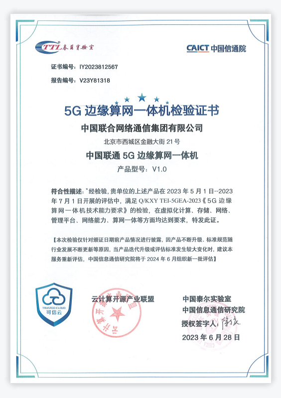 此外,中国联通5G边缘算网一体机通过了边缘计算最新评估。