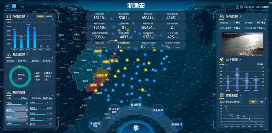 针对浙江海洋渔业发展痛点问题,浙江移动深刻剖析海上渔船事故原因,协助浙江省农业农村厅规划建设“渔船安全精密智控系统(浙渔安)”,使用5G网络与卫星网相融合的技术建设卫星宽带通信网、安全生产预警网、沿岸智慧渔港网,通过船岸一体化管理实现了人清、船清、港清,增强渔船装备现代化与安全管理运营保障能力。自系统上线运行以来,浙江省海洋渔业全行业的安全生产事故数同比下降88.9%,事故失踪人数同比下降72.2%,挽回损失2.2亿元,渔民增收15%,交易效率提升20%,促进渔业经济可持续发展。