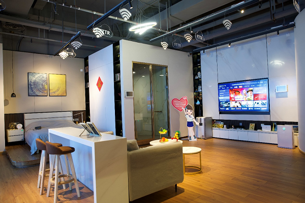 厅内智慧家庭区域(约150平方米)采用全光WiFi家庭解决方案1主光猫+2从光猫部署,通过暗管+透明光纤混合布线方式提供全场景智慧生活解决方案。通过VR游戏体验、天翼看家等智能产品,展示全光WiFi助力下的智慧生活,并以场景化、互动化的方式体现全光WiFi超千兆速率、广覆盖、超多链接,无缝漫游等优势。