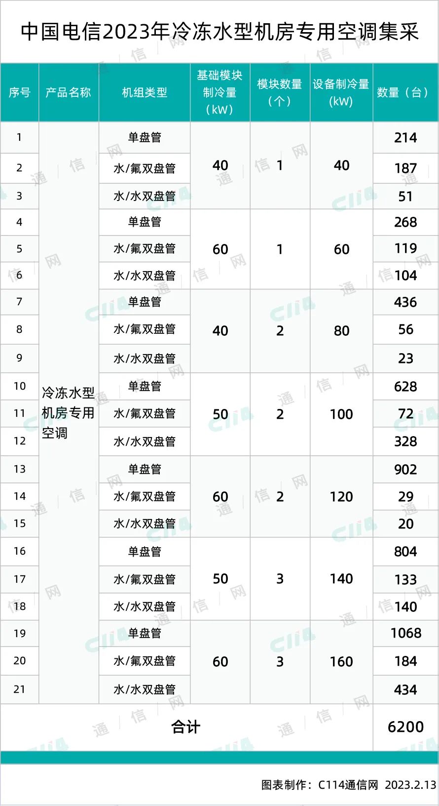 据此前中国电信发布的集采公告显示,本次主要采购中国电信集团有限公司和中国电信股份有限公司及其下属子公司、分公司在两年内所需的冷冻水型机房专用空调产品。采购总规模预估约6200台。项目不划分标包,具体采购机组类型及规模见下表: